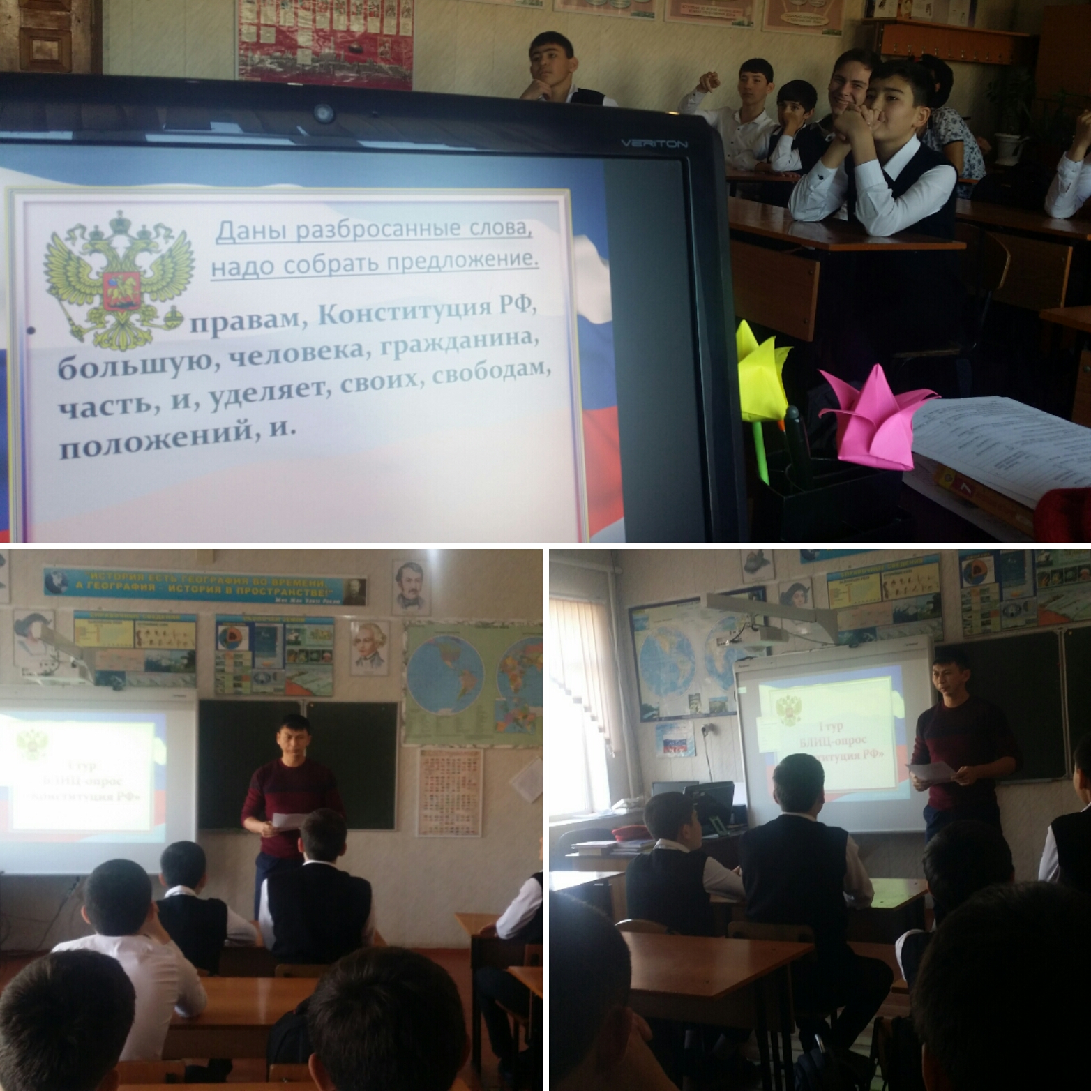 Учителем истории Сатыровым А.А. было проведено внеклассное мероприятие посвященное "Дню Конституции РФ" в виде викторины между 8-11 классами.